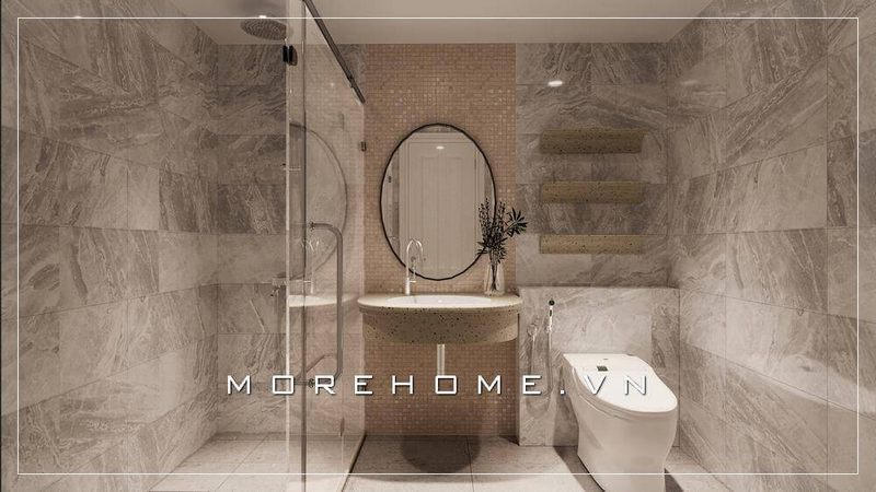 Mẫu thiết kế phòng tắm hiện đại, tối giản về nội thất, chỉ để những vật dụng cần thiết kết hợp tông màu gạch ốp lát tươi sáng tạo không gian phòng khách thông thoáng