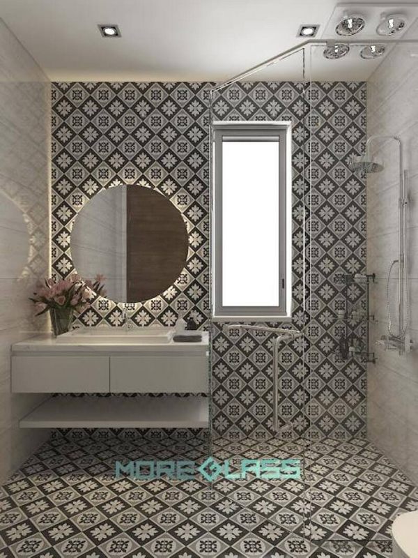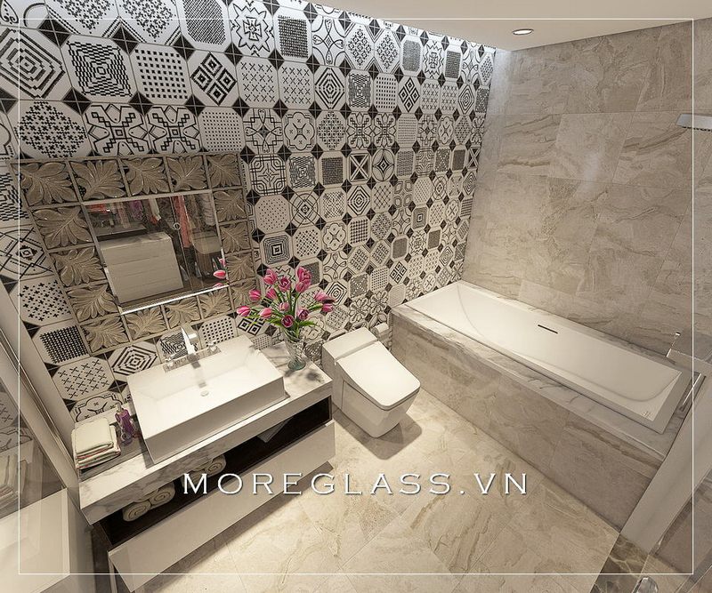 Mẫu thiết kế phòng tắm hiện đại với thiết bị vệ sinh đơn giản, tinh tế nổi bật với bức tường gạch men họa tiết độc áo.