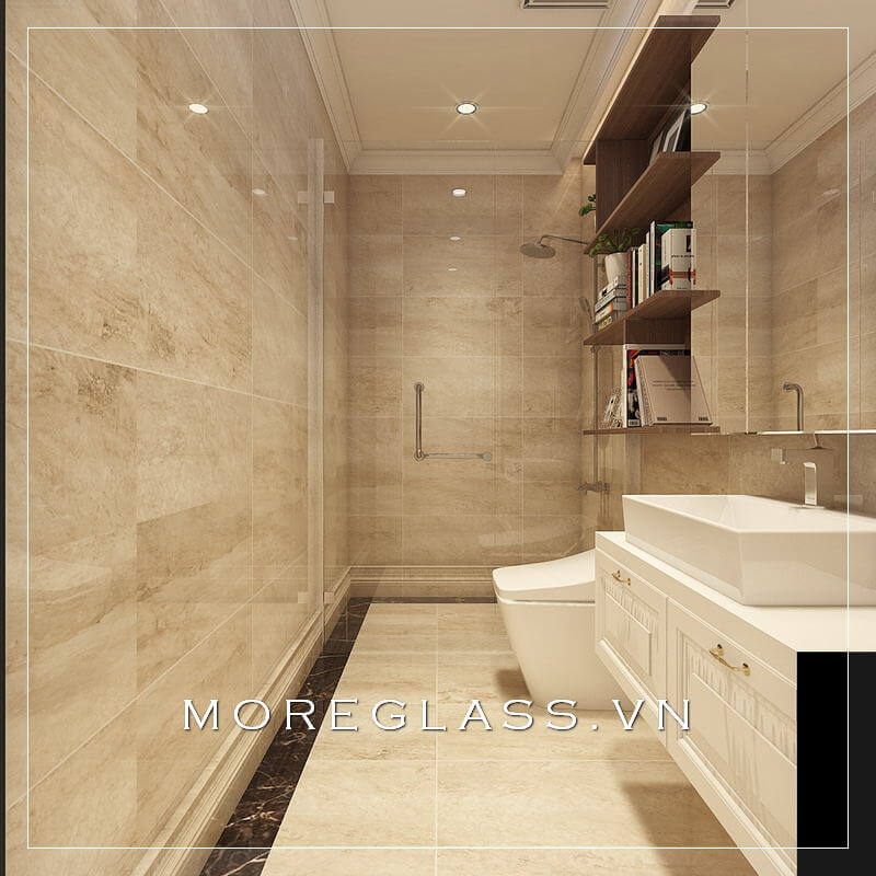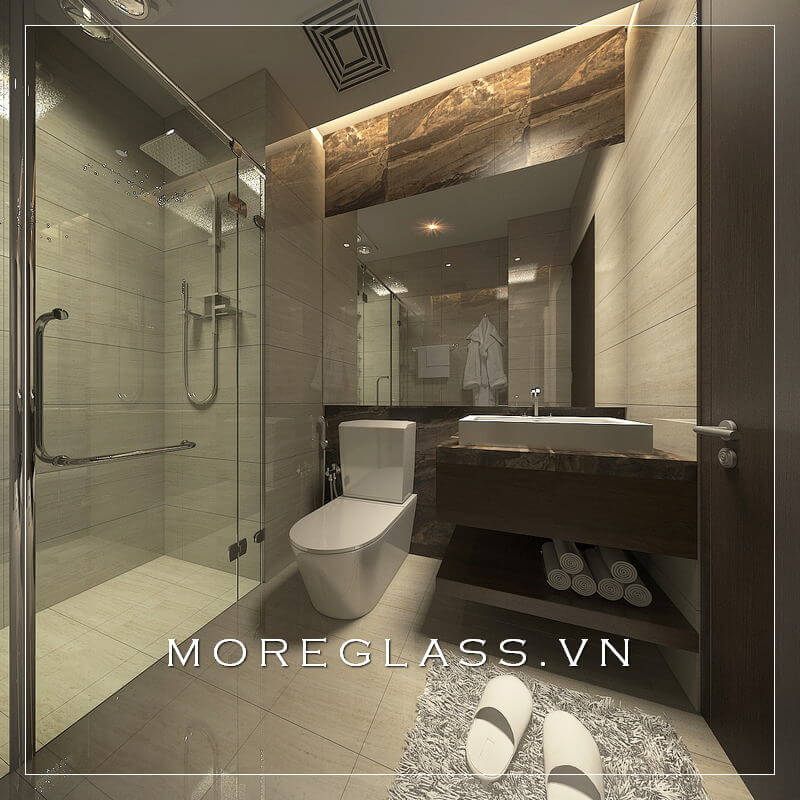 Thiết kế phòng tắm chung cư hiện đại, thoáng rộng khi kết hợp với các vật liệu như gạch và kính