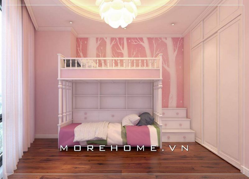 Mẫu giường tầng với thiết kế hiện đại và ấn tượng tone màu hồng nhẹ nhàng cũng được sử dụng phù hợp với khéo léo để tiết kiệm không gian tối đa nhất cho con bạn vừa có không gian nghỉ ngơi và học tập thoải mái nhất