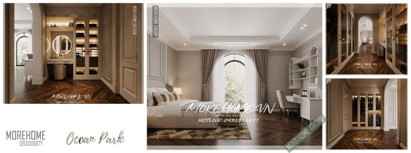 Mẫu thiết kế phòng ngủ liền phòng thay đồ cho chung cư, nhà phố, biệt thự có diện tích rộng, với phong cách tân cổ điển nhẹ nhàng, mang đến không gian nghỉ ngơi thư giãn sang trọng cho gia chủ