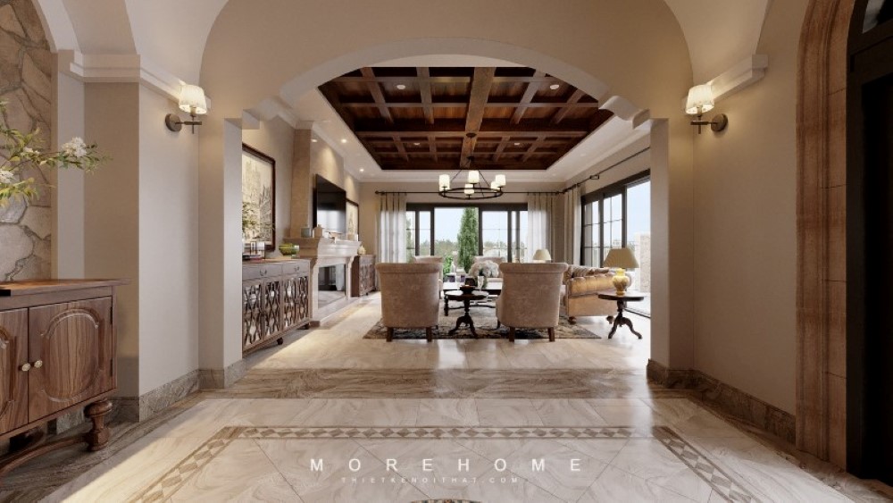 Chọn một sofa văng tân cổ điển bọc nỉ màu kem độc đáo là lựa chọn hoàn hảo để trang trí không gian phòng khách biệt thự, đem lại sự ấn tượng mạnh mẽ.