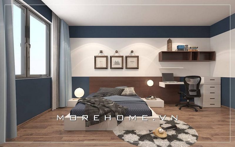 Để trang trí phòng ngủ của 2 bé trai, hãy sử dụng một tủ áo độc đáo và kết hợp nó với một bàn học hiện đại.
