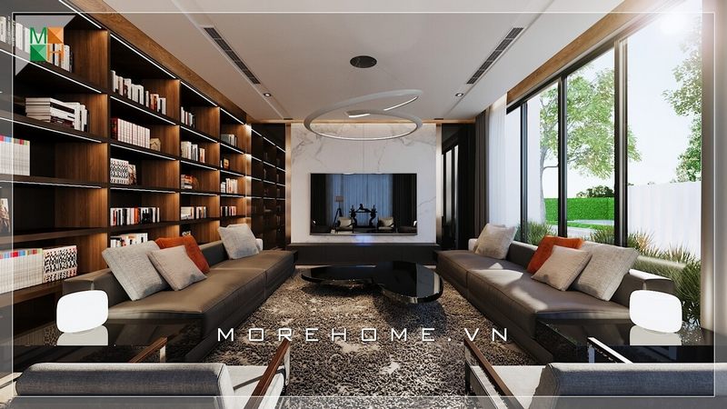 Sofa văng hiện đại với vỏ bọc da nâu đen cao cấp, có thiết kế theo phong cách hiện đại, góp phần tạo nên vẻ đẹp, tiện nghi và thoáng đãng cho phòng khách biệt thự, nhà phố.